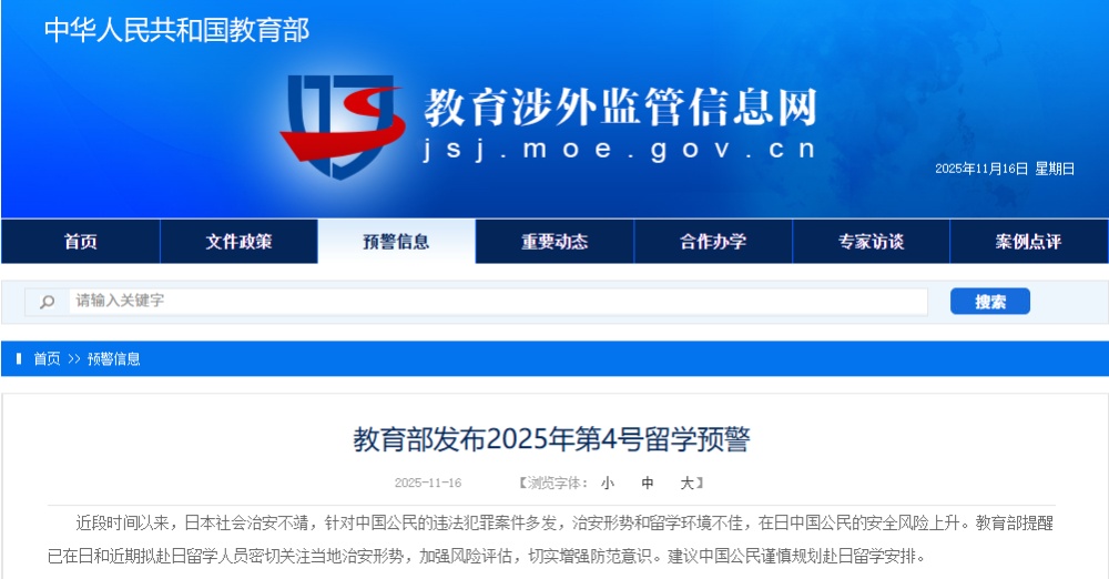 近年来,日本治安形势不稳定,针对中国公民的刑事案件接连发生。治安形势和留学环境较差,中国在日居民安全风险加大。教育部提醒已在日本以及近期计划赴日留学的人员,密切关注当地安全形势,加强风险评估,切实提高防范意识。建议中国公民谨慎规划赴日留学计划。网站截图